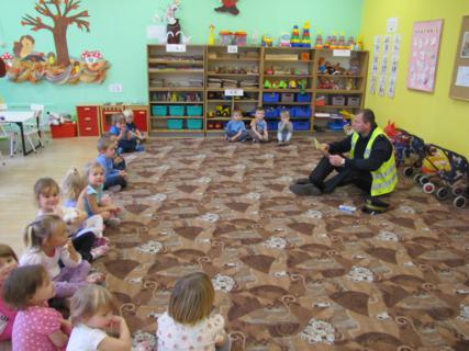 ul. Kilińskiego w Trzebiatowie. Funkcjonariusze z dozą humoru przeczytali 3- latkom z grupy „Krasnale” dwie bajki promujące bezpieczne